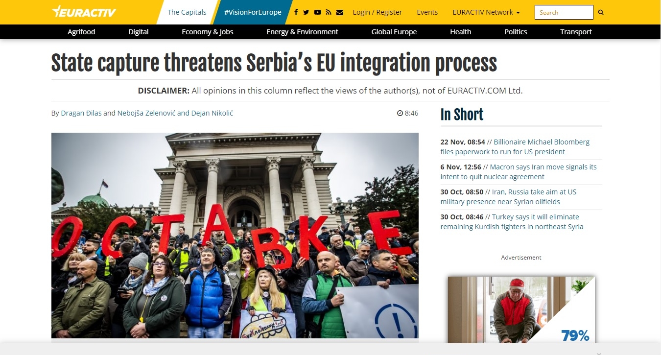 [У наставку представљамо ауторски текст председника Странке слободе и правде Драгана Ђиласа, председника Заједно за Србију Небојше Зеленовића и потпредседника Демократске странке Дејана Николића објављен на познатом европском порталу "Еурактив" са седиштем у Бриселу, а на тему алармантног назадовања Србије на путу евроинтеграција под вођством Александра Вучића:]